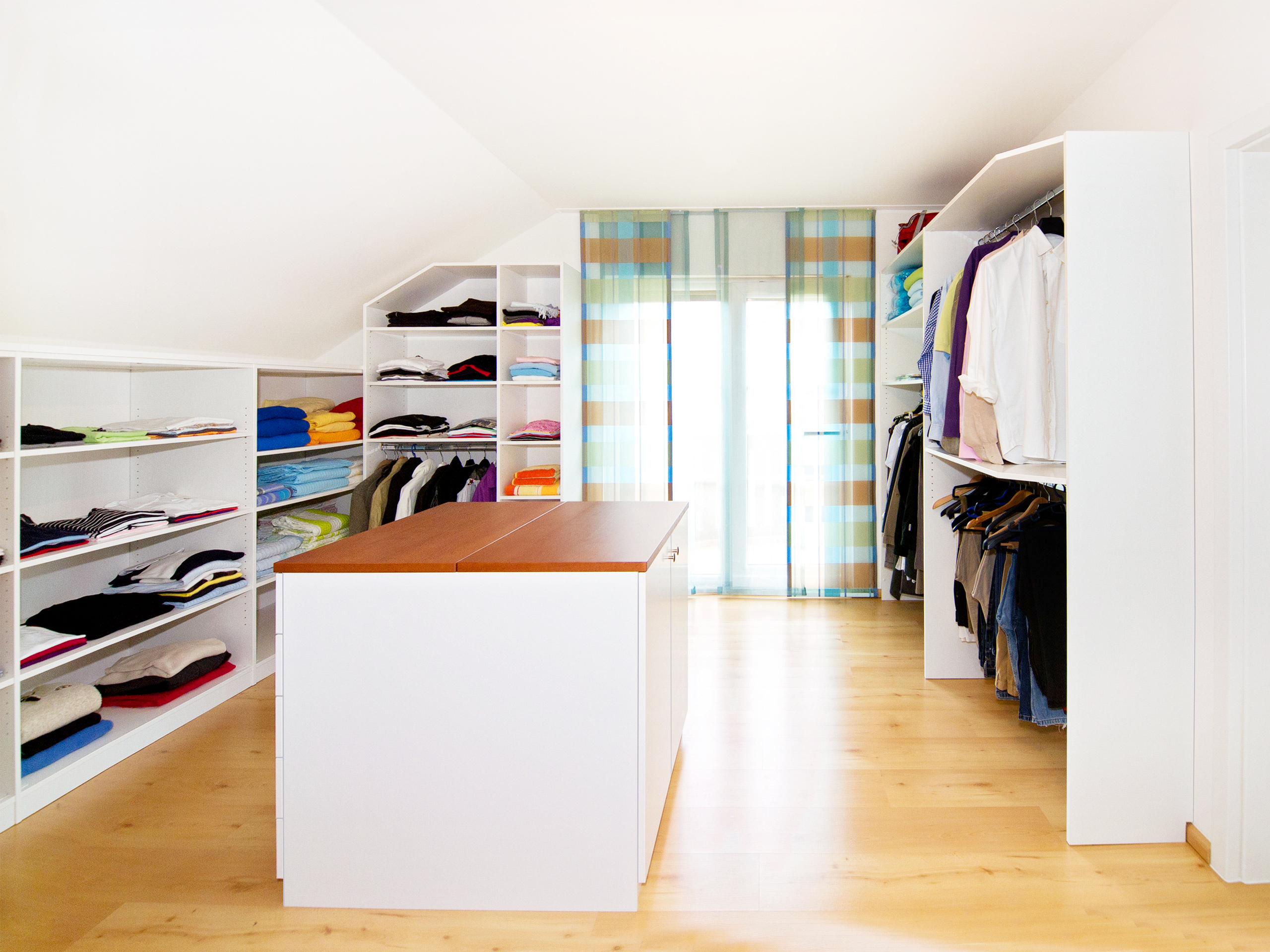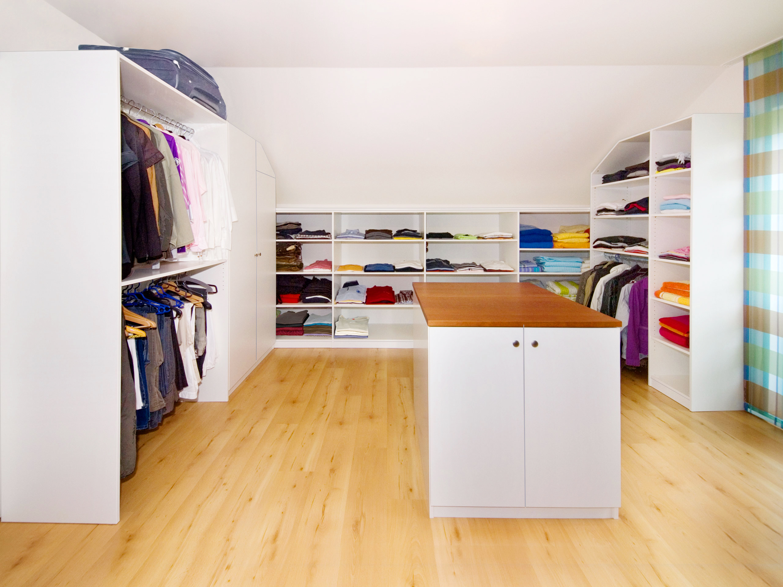 Wie viel mehr Freude die eigene Garderobe bereitet, wenn alles übersichtlich und ansprechend aufbewahrt wird, zeigt diese moderne Einrichtung für das Ankleidezimmer in einer Dachschräge.