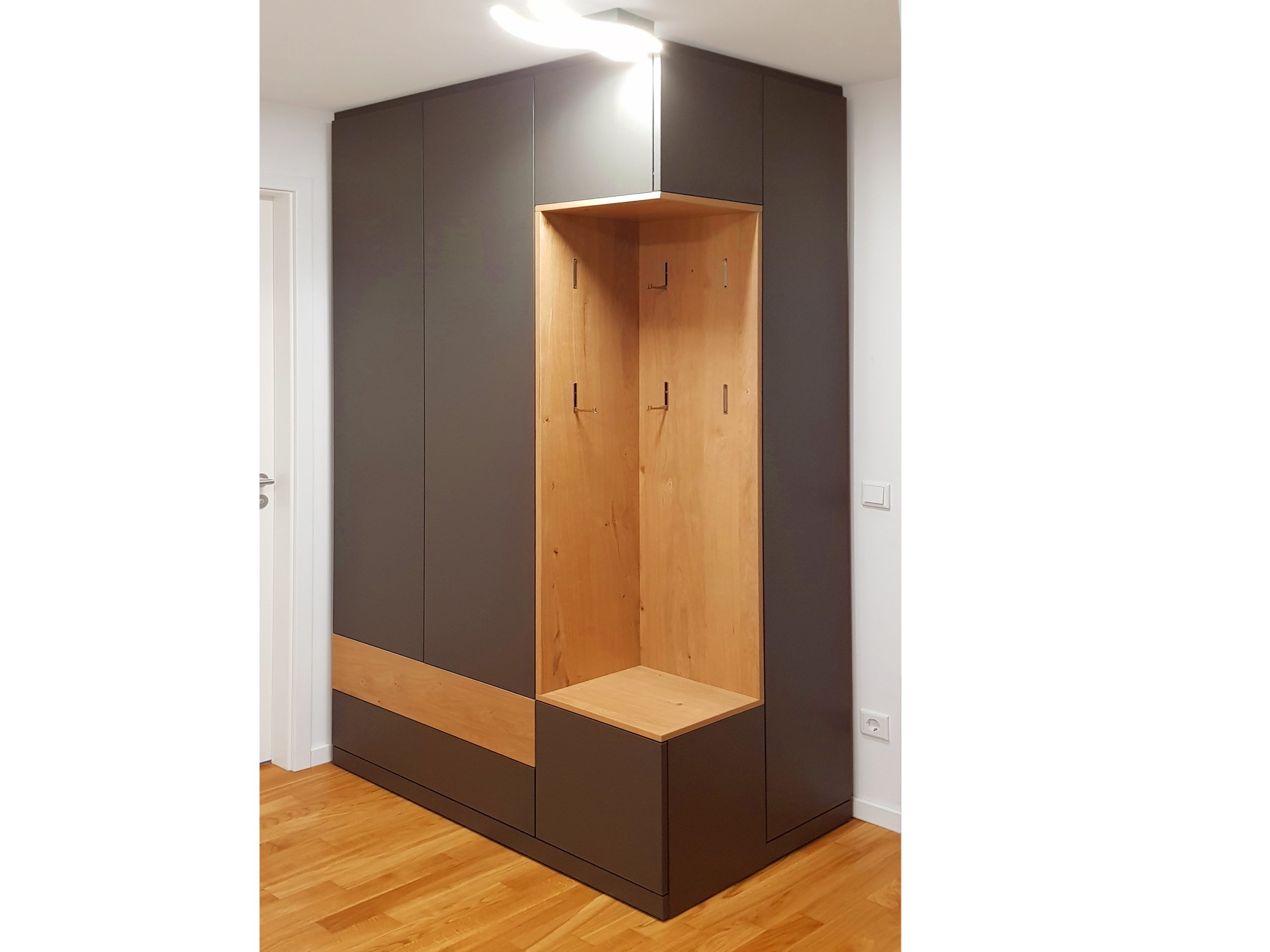 In der offenen Garderobennische sind Klapphaken in die Möbelseiten eingelassen. Gäste finden jederzeit einen Platz für Ihre Kleidung.